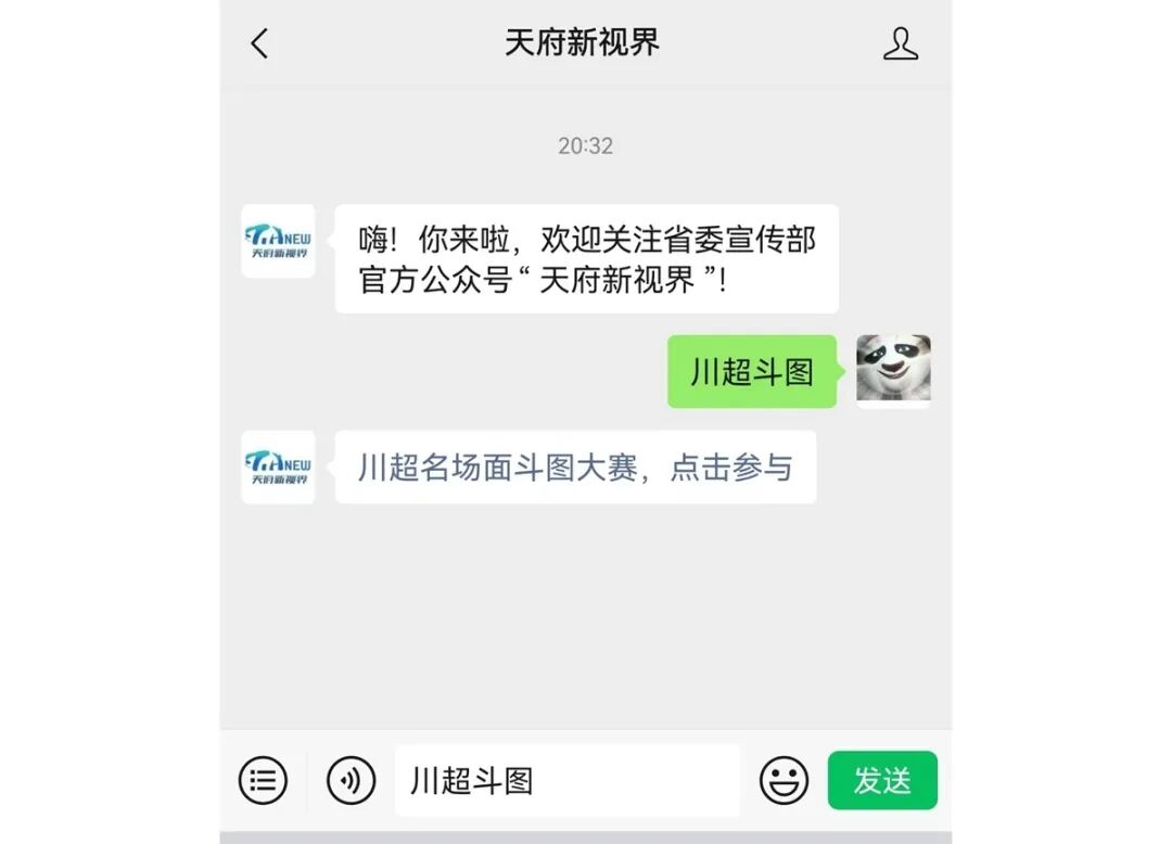 入口四:关注“天府新视界”微信公众号,对话框私信回复【川超斗图】,即可获取活动链接点击参与。