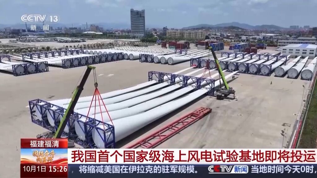 总台记者 黄珊:海上风电试验基地包括陆上检测中心和试验风电场两部分,陆上检测中心坐落于福清市的江阴产业园内,靠近江阴港码头,旁边是福建最大的风电产业园。整个陆上检测中心包含了叶片试验平台和传动链测试平台。