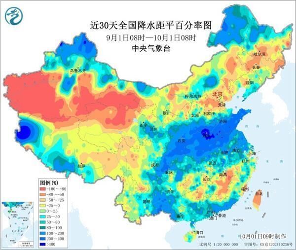 先来看降水,9月以来雨水仿佛在华西到黄淮一带安了家,尤其川陕交界、河南、山东南部、安徽北部、江苏北部等地,降水较常年同期偏多2倍以上。其中河南9月平均降雨量为同期最多,四川同期第二多,陕西、山东同期第三多。大城市中,河南郑州9月累计降雨量327.6毫米,是常年水平(78.2毫米)的4倍多!