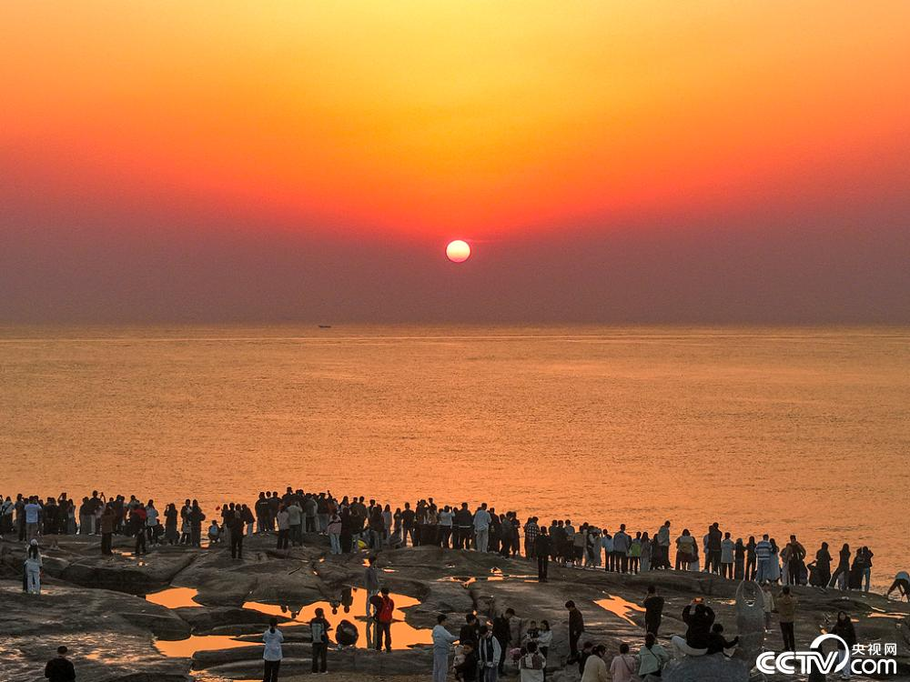 10月1日清晨,山东省日照市灯塔景区海滨聚集了成千上万的市民和游客,众人手举五星红旗,站在礁石上迎接国庆的第一缕阳光。