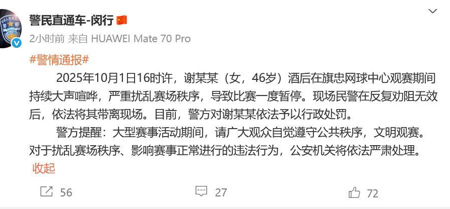 ·上海网球大师赛女球迷多次尖叫干扰比赛,警方通报:酒后严重扰乱赛场秩序,已行政处罚。