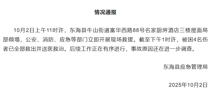 ·江苏东海县一饭店举办宴席时房顶塌陷,当地应急管理局通报:被困4名伤者已全部救出。