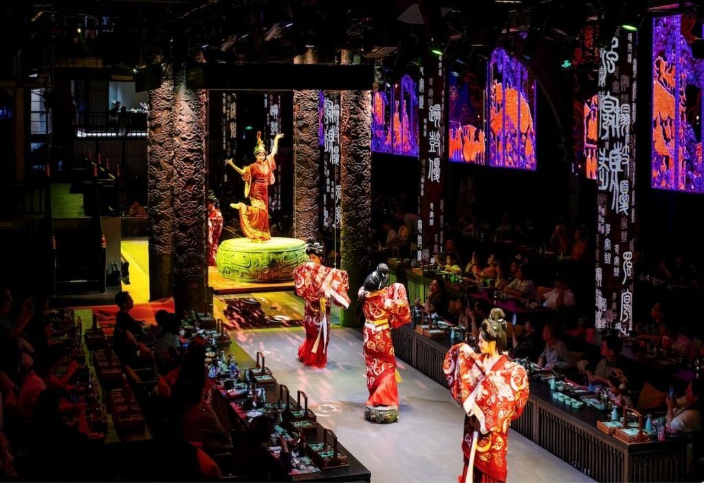 东郊记忆园区相关负责人曾表示:“活化不是改造,是‘对话’”。在不破坏遗迹本体的前提下,园区以创意为笔,为老空间注入新活力:仓库遗留的玻壳被改造为带灯光的反锥形装置,夜晚亮起时如同悬浮的星光,成为园区热门网红打卡点;原高温玻璃车间凭借高挑空、大跨度的空间优势,转型为专业剧场,汉文化主题餐秀在此上演时,古典歌舞与工业风建筑碰撞出独特韵味。