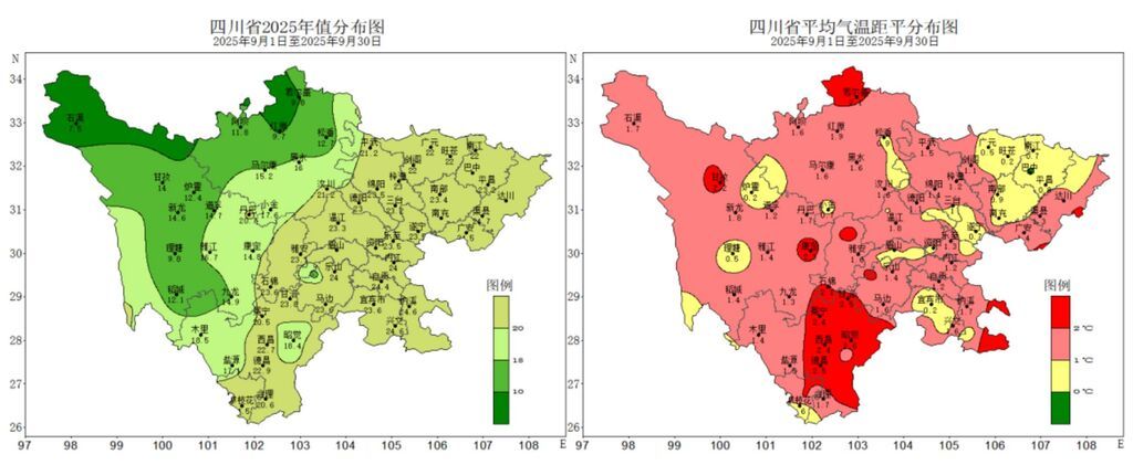 气象监测显示,9月,四川全省平均气温21.4℃,偏高1.4℃,排历史同期第4高位;全省平均降水量208.7毫米,偏多62%,位列历史同期第2位。全省平均日照时数101.5小时,较常年同期略偏少3.0%。