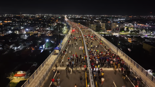 当地时间5日,由中企承建的圭亚那巴拉特·贾格迪奥-德梅拉拉河大桥正式通车,圭亚那总统阿里、总理菲利普斯、副总统贾格迪奥,中国驻圭亚那大使杨扬等两国政要及社会各界代表上万人参加了通车仪式。