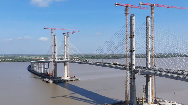 新德梅拉拉河大桥位于圭亚那首都乔治敦,是圭亚那迄今规模最大、技术最复杂的交通基础设施工程。桥梁全长约2900米,设计时速80公里,桥面为双向四车道,设计使用年限100年。(总台记者 耿之倩)