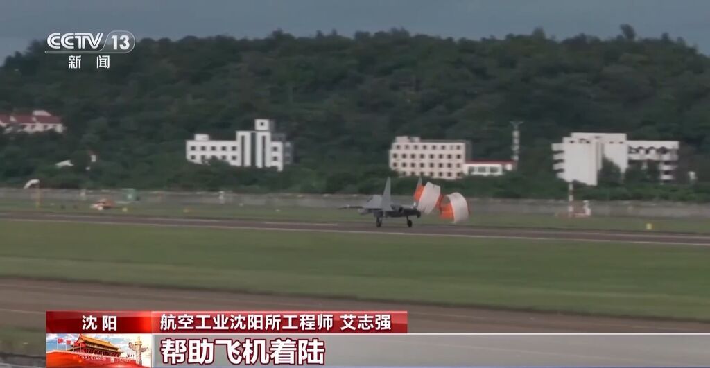 航空工业沈阳所工程师 艾志强:这个是减速伞,在前端还有一些比如说干扰弹、曳光弹这些武器装备。飞机着陆时候,在飞机后边,就抛出一个像降落伞一样的东西来帮助飞机,快速降低速度,帮助飞机着陆。
