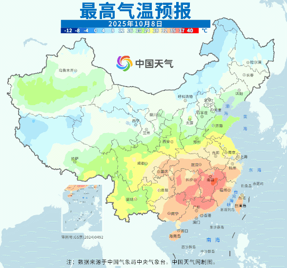 今后7天,江西、浙江、福建、广东北部、广西东北部、湖南南部等地有35℃以上高温天气,部分地区可达38℃左右,气温较常年同期明显偏高。