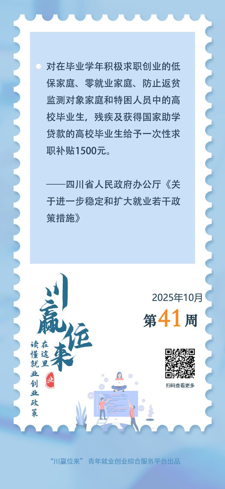 根据四川省人民政府办公厅《关于进一步稳定和扩大就业若干政策措施》相关规定,在毕业学年积极求职创业的低保家庭、零就业家庭、防止返贫监测对象家庭和特困人员中的高校毕业生,残疾及获得国家助学贷款的高校毕业生,可给予一次性求职补贴1500元。