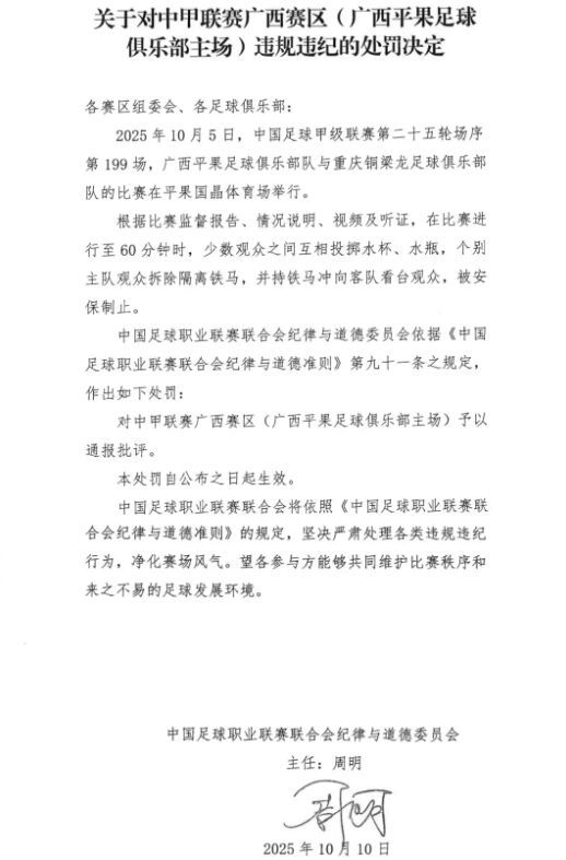 10月10日,中国足球职业联赛联合会(以下简称中足联)在官网针对10月5日本赛季中甲联赛第25轮广西平果队主场与重庆铜梁龙队比赛连续发布三份处罚决定。重庆铜梁龙队员黄希扬、广西平果队主教练前田浩二以及广西赛区(广西平果足球俱乐部主场)分别受到处罚。