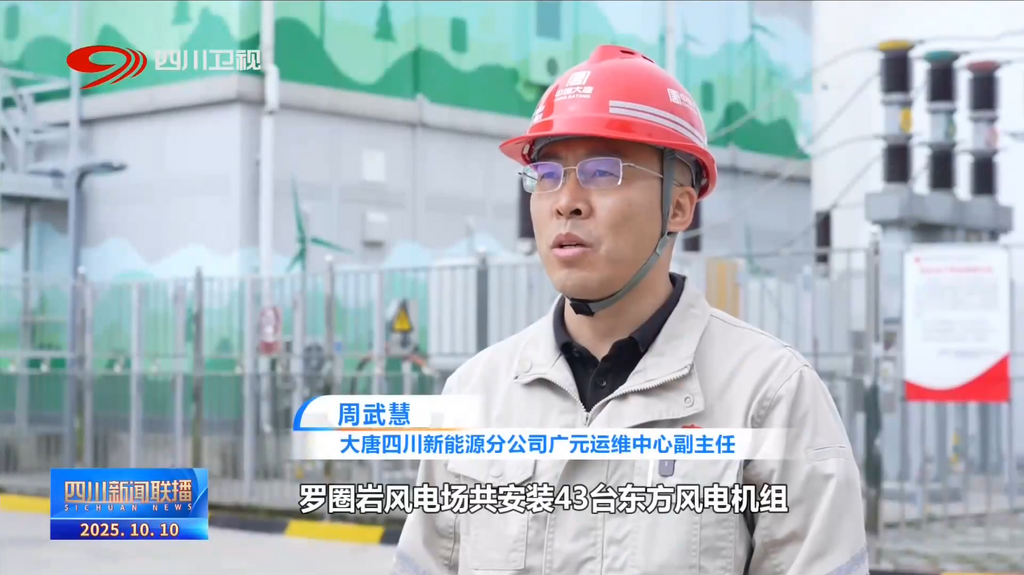 大唐四川新能源分公司广元运维中心副主任 周武慧:罗圈岩风电场共安装43台东方风电机组,每年可节约标准煤约6.59万吨,每年可减少烟尘排放量约701吨,(减少)二氧化碳排放量约16.19万吨,具有较好的环保效益。