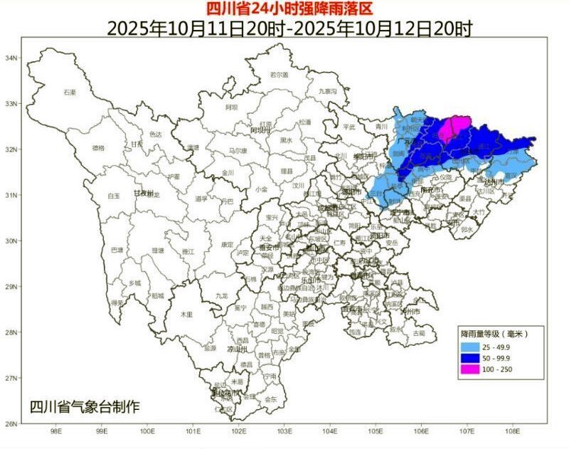 10月11日20时到12日20时:巴中和广元东部、达州北部、南充西部、绵阳东部和遂宁北部有大雨到暴雨(雨量40~80毫米),局地大暴雨(雨量120~160毫米),最大小时雨强20~50毫米。受冷空气影响,盆地中部、北部有4-6级偏北风,局地可达7级或以上。