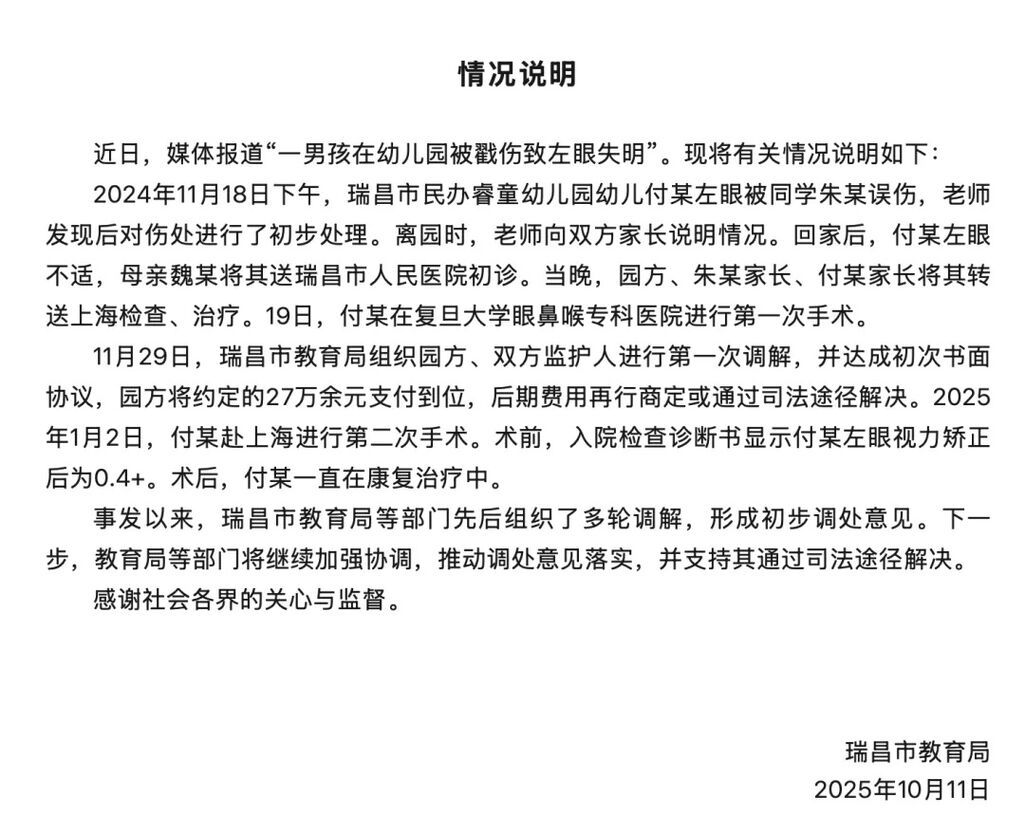11月29日,瑞昌市教育局组织园方、双方监护人进行第一次调解,并达成初次书面协议,园方将约定的27万余元支付到位,后期费用再行商定或通过司法途径解决。2025年1月2日,付某赴上海进行第二次手术。术前,入院检查诊断书显示付某左眼视力矫正后为0.4+。术后,付某一直在康复治疗中。