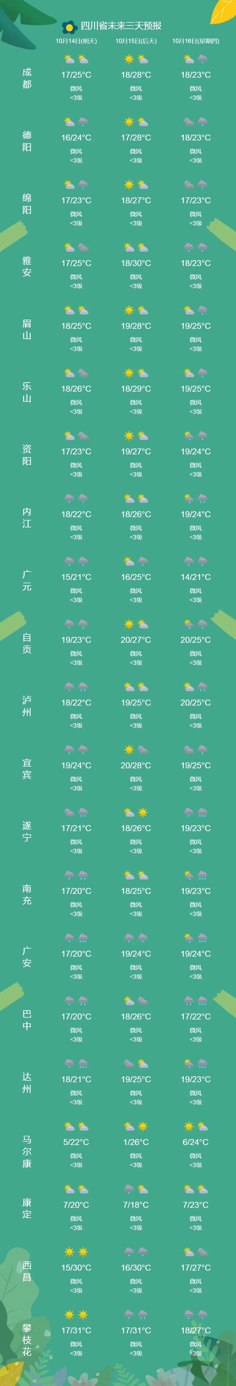预计盆地气温高点将出现在周三,大部城市25℃至30℃,随后气温开始走“下坡路”,到10月20日前后日最高气温只有1字头。