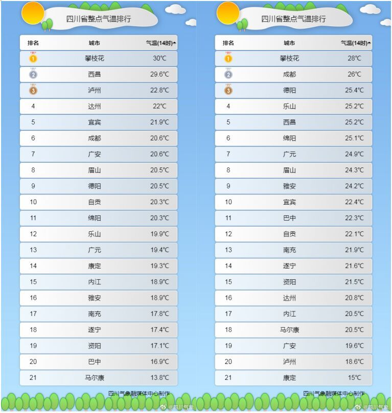 相比之下,今天白天,包括成都在内,盆地各市的气温倒是比昨天上升了不少。