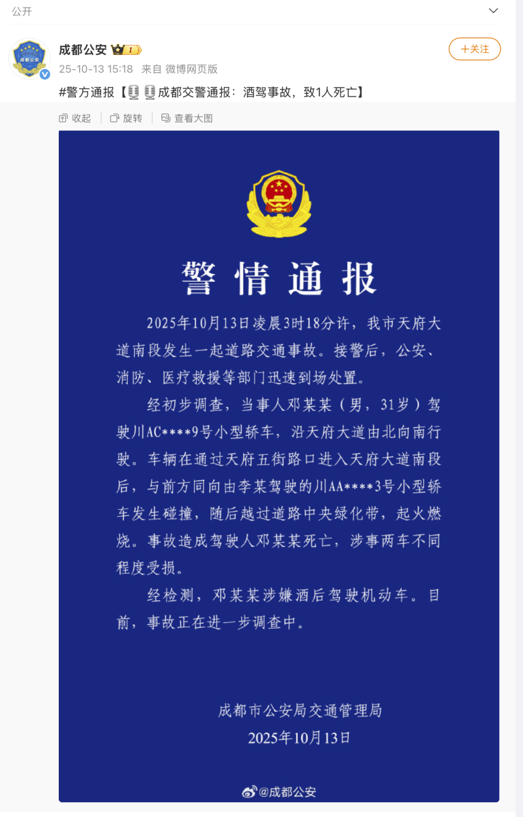 ·成都通报天府大道交通事故:邓某某涉嫌酒后驾车与轿车碰撞后越过绿化带起火燃烧,当事人死亡。