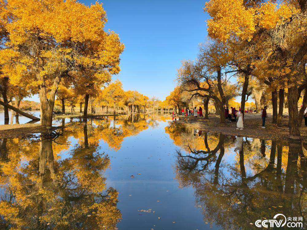 10月12日,内蒙古阿拉善盟额济纳旗,额济纳大漠胡杨林进入一年中最漂亮的时间周期,大量游客行走在胡杨林间,观赏金黄色的胡杨林,拍照合影留念。