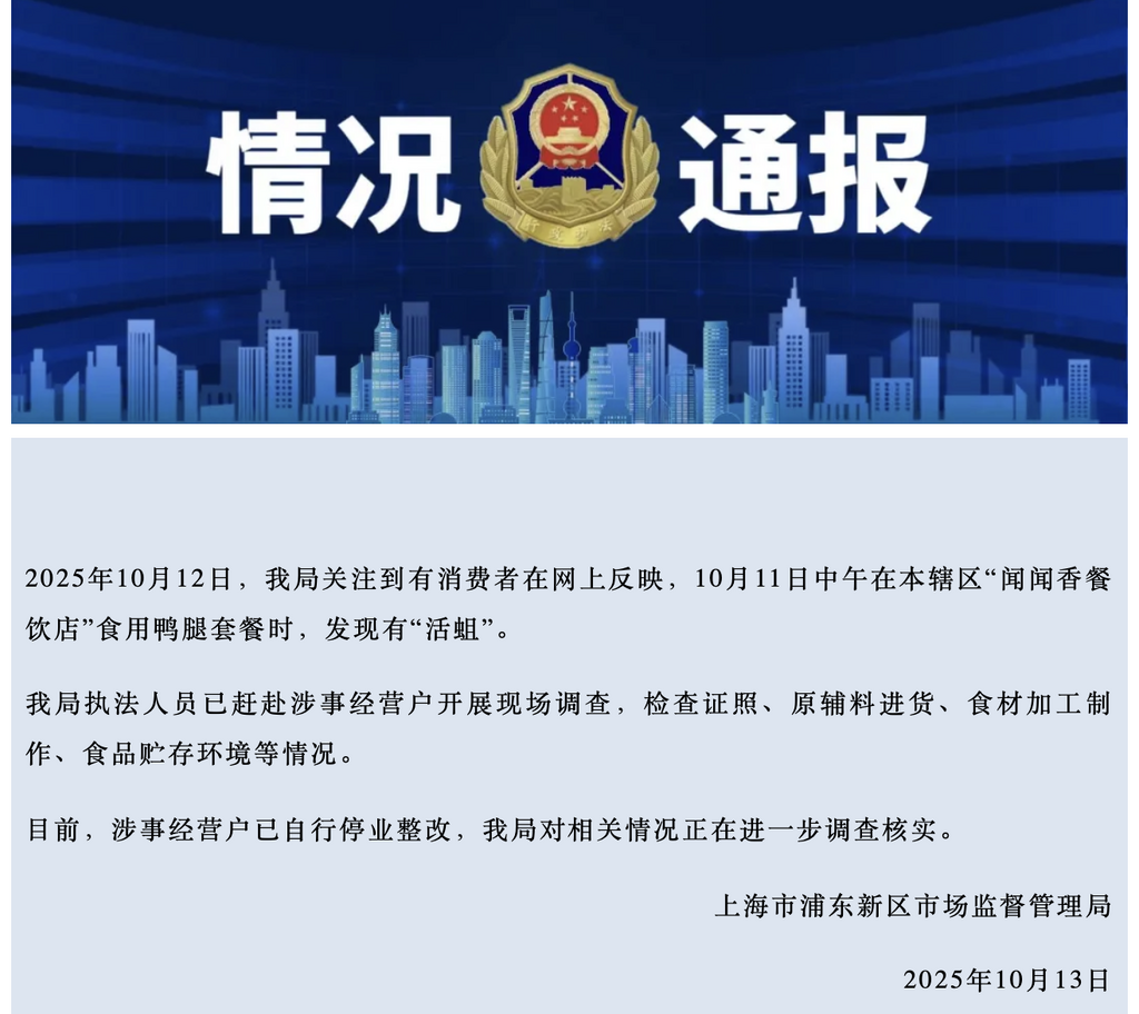 ·官方通报鸭腿套餐被发现有“活蛆”:涉事经营户已自行停业整改。