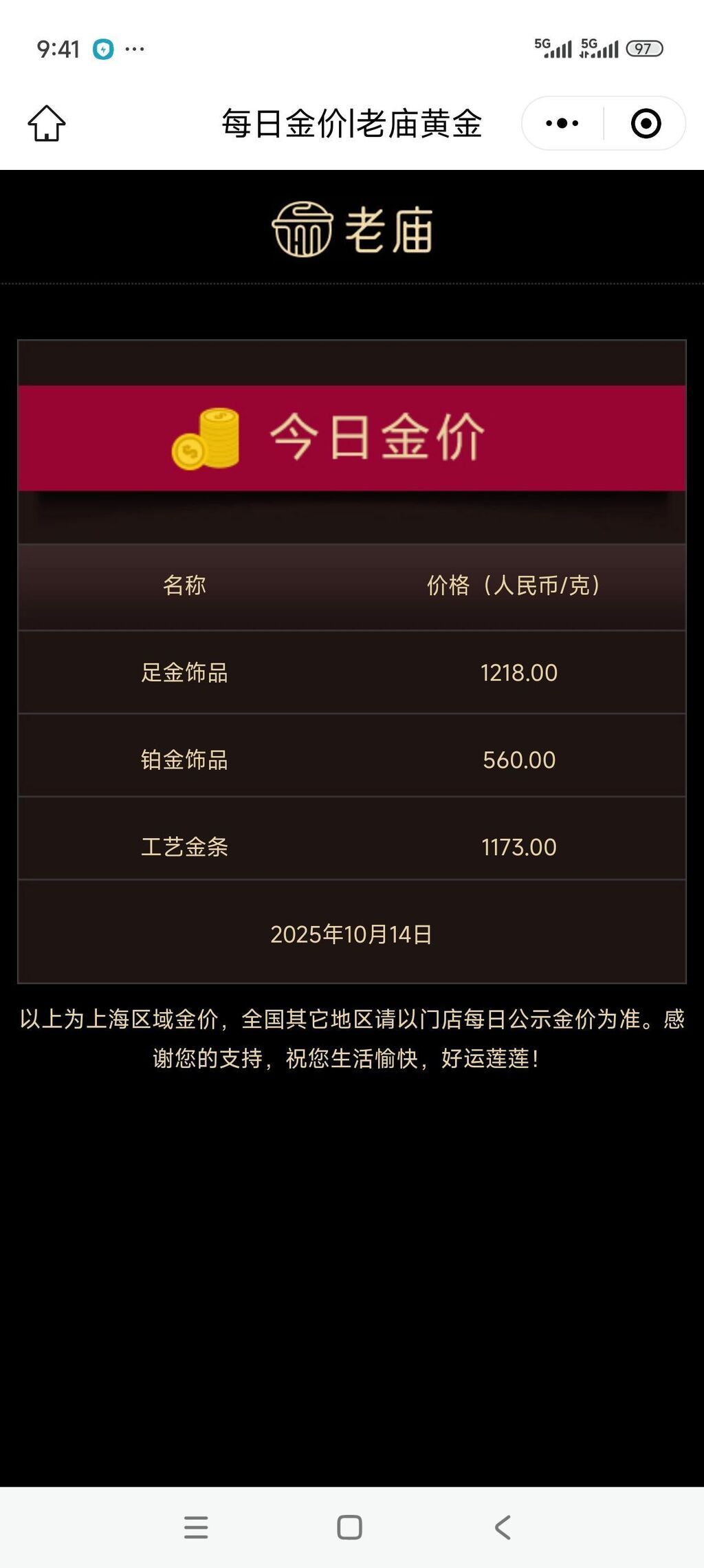 周生生金饰价格1213元/克,较前一日1188元/克的价格上涨25元/克;老庙黄金足金饰品标价1218元/克,较前一日1189元/克的价格上涨29元/克;老凤祥足金饰品标价1206元/克,克价较昨天1182元/克上涨24元。