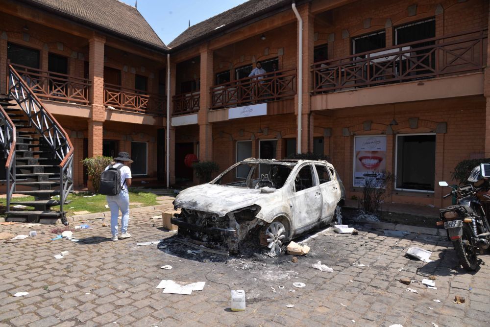 这是9月26日在马达加斯加塔那那利佛商业区拍摄的被损坏的汽车和商铺。新华社发(西塔卡·拉乔纳里松摄)
