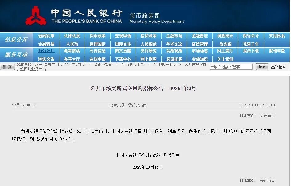 为保持银行体系流动性充裕,2025年10月15日,中国人民银行将以固定数量、利率招标、多重价位中标方式开展6000亿元买断式逆回购操作,期限为6个月(182天)。