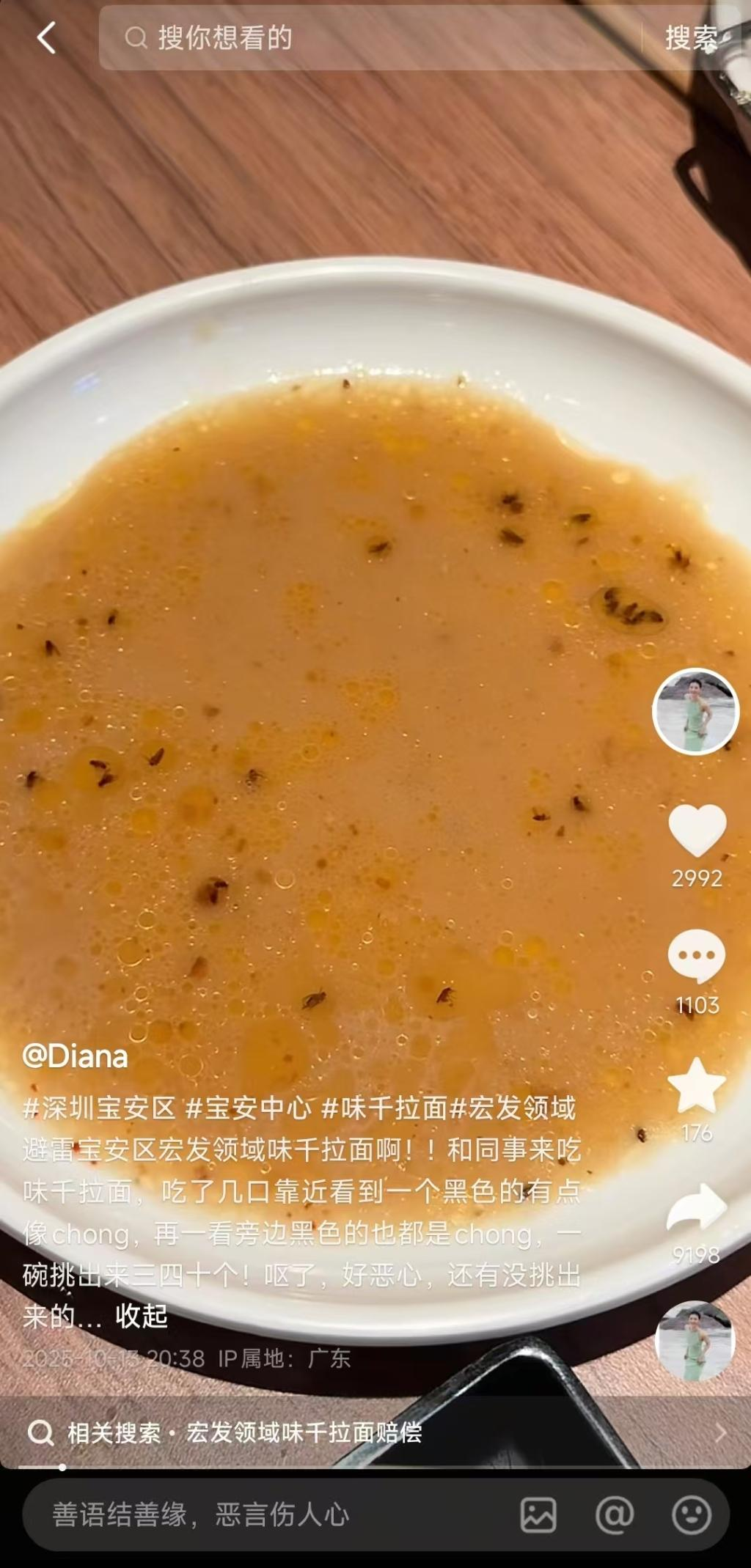 ·味千拉面碗里漂着很多黑色小虫子?深圳宝安区市监局:跟进调查处理。