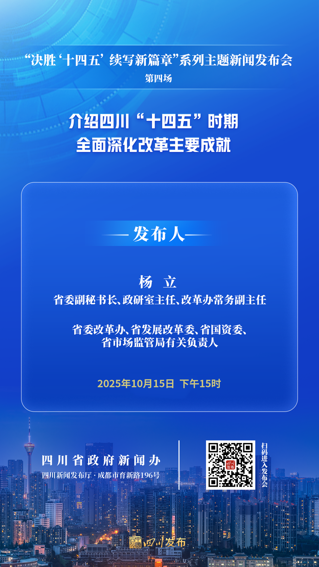 2025年10月15日(星期三)15:00,省政府新闻办将在四川新闻发布厅举行“决胜‘十四五’ 续写新篇章”系列主题新闻发布会第四场,省委副秘书长、政研室主任、改革办常务副主任杨立围绕四川“十四五”时期全面深化改革主要成就作介绍,省委改革办、省发展改革委、省国资委、省市场监管局有关负责人参加答记者问。四川发布客户端将全程图文直播,敬请关注!