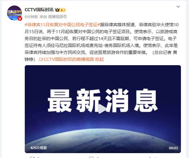 据菲律宾媒体报道,菲律宾驻华大使馆10月15日说,将于11月起恢复对中国公民的电子签证项目。使馆表示,以旅游或商务目的赴菲的中国公民,若行程不超过14天且不需延期,可申请电子签证。电子签证持有人须经马尼拉国际机场或麦克坦-宿务国际机场入境。使馆表示,此举是菲律宾持续加强与中方民间交流、促进贸易旅游合作的重要举措。