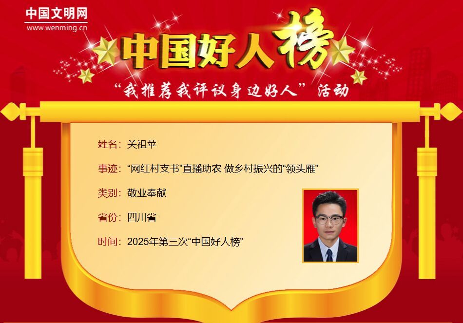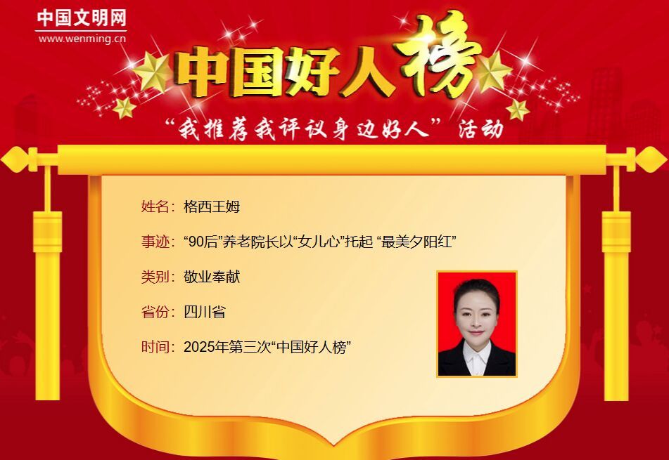10月15日,2025年第三次“中国好人榜”发布仪式暨全国道德模范与身边好人现场交流活动在新疆维吾尔自治区阿克苏地区举行。四川此次共有3人荣登2025年第三次“中国好人榜”,分别是关祖苹、格西王姆、唐术华三位“中国好人”。