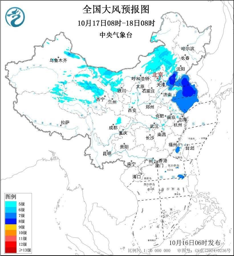 预计,10月16日08时至17日08时,新疆东部、西藏北部、青海北部和西部、甘肃西北部和东南部、宁夏、内蒙古中西部、陕西中北部、山西中北部、河北西北部、辽宁南部、山东北部等地的部分地区有5~6级、阵风7~9级的大风;渤海、黄海东南部、南海东北部的部分海域将有7~8级、阵风9级的大风。