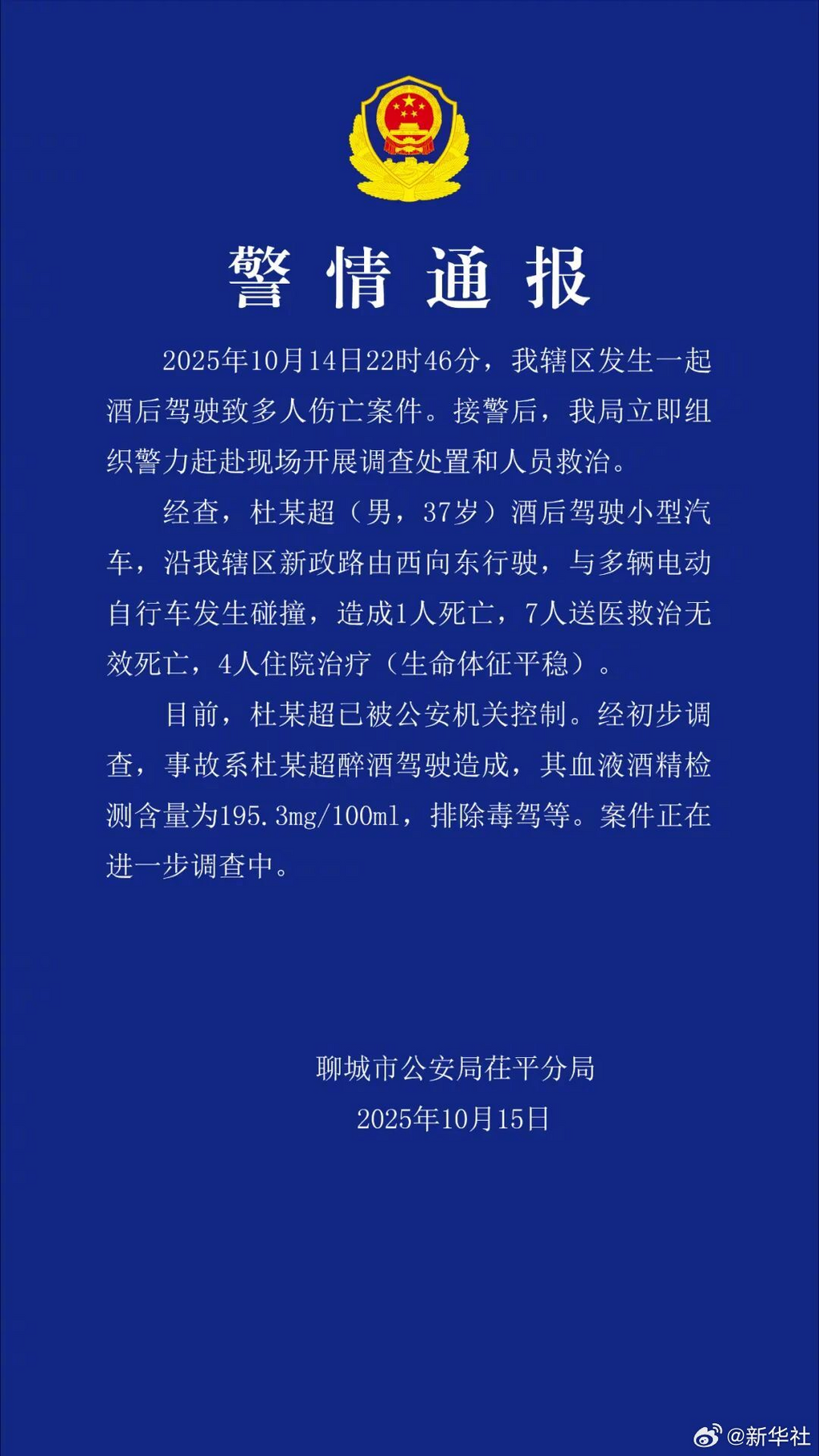 ·山东聊城一男子酒驾致8死,已被公安机关控制。