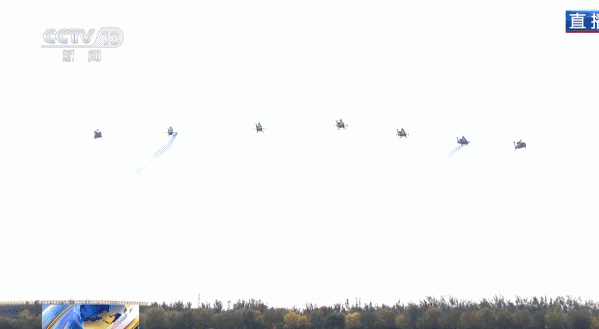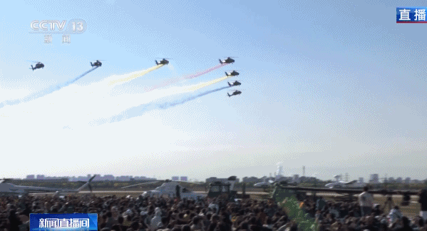 由5架直-10、2架直-20,共计7架直升机,组成箭形编队,拉出三色彩烟。