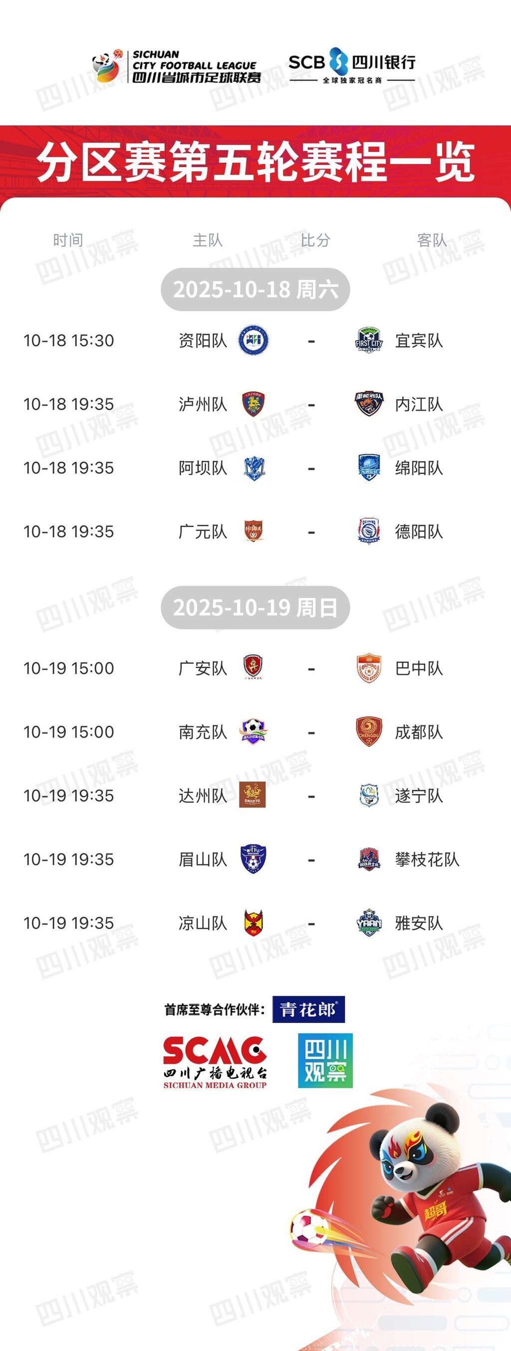 2025/2026四川银行四川省城市足球联赛(简称“川超”)分区赛第五轮周末继续狂欢!10月18日、19日两天连赛,周六4场+周日5场,好戏连台、精彩加码,让你看过瘾!