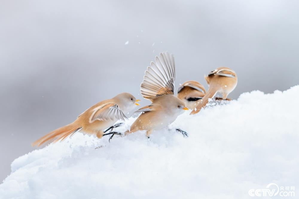 10月17日,黑龙江省大庆市龙凤湿地自然保护区,金秋十月,油城第一场雪下两天,湿地精灵文须雀在芦苇荡冰雪中觅食,嬉戏。