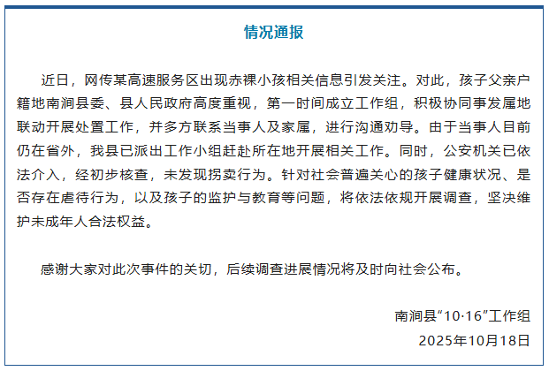 ·云南南涧县通报高速服务区出现赤裸小孩:初查未发现拐卖,将调查是否存虐待。