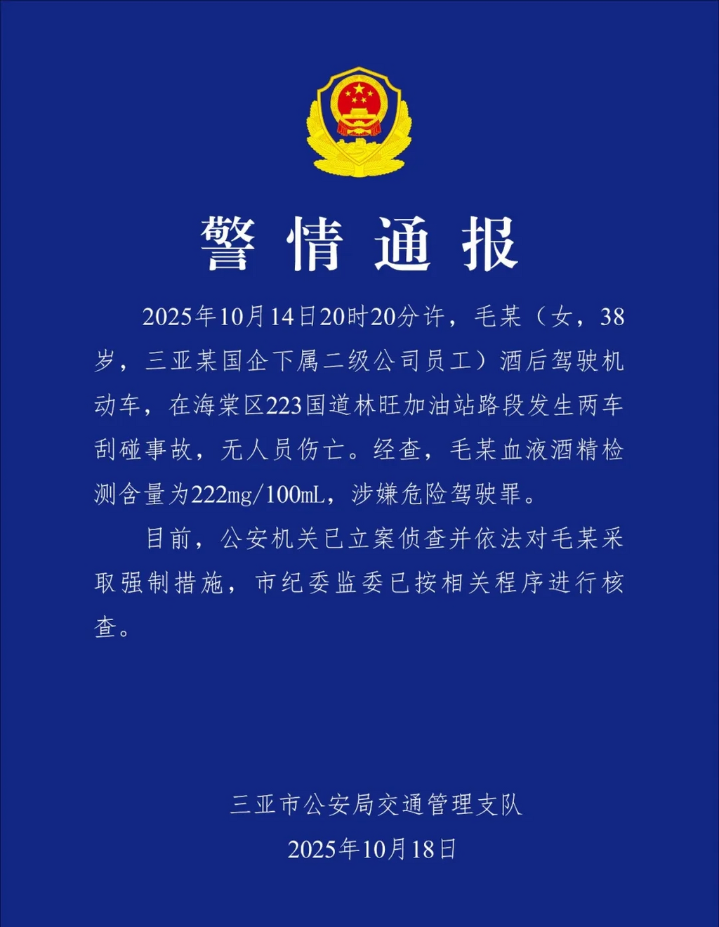 ·三亚警方通报“女子酒驾自称国企员工求通报”:涉嫌危险驾驶罪,被采取强制措施。