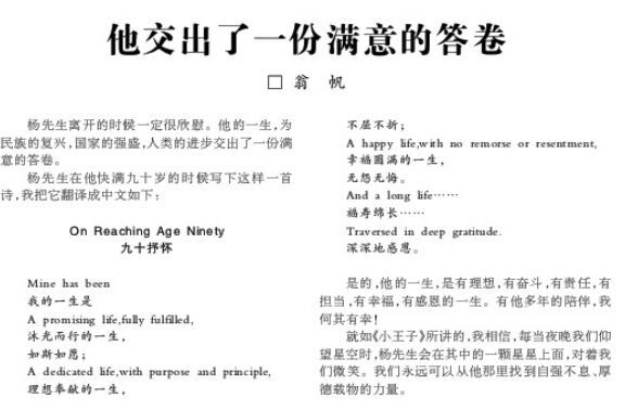 杨先生在他快满九十岁的时候写下这样一首诗,我把它翻译成中文如下: