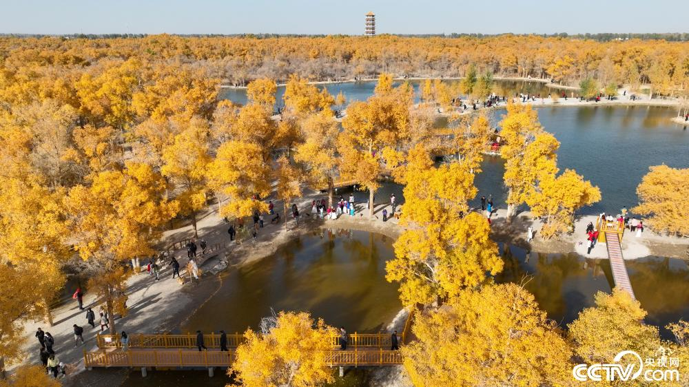 10月18日,甘肃省酒泉市金塔沙漠胡杨林景区黄金的胡杨林与碧绿的湖水相映成景,犹如金色的童话世界,吸引众多游客前来游览观光。
