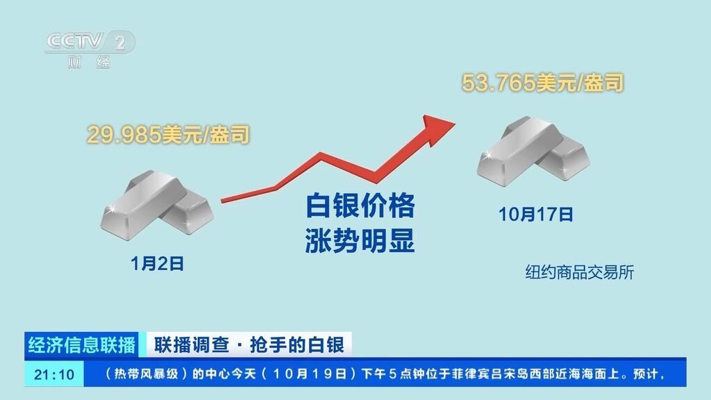 今年以来,白银价格涨势明显。纽约商品交易所COMEX白银10月17日价格一度触及每盎司53.765美元,较今年1月2日价格29.985美元累计上涨超过70%。