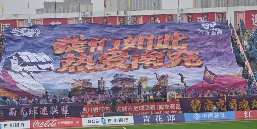 在他们正对面的东区看台,是南充本地蜀魂球迷协会和本地足球联盟组织的本地球迷团们。隔着绿茵场,东看台的本地球迷,和西看台的外国球迷们,还上演一次次互动。