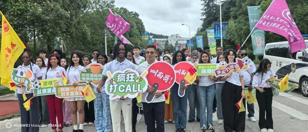 西区看台上,一群不同肤色的面庞,格外引人注目。这是来自西华师范大学国际学院和南充职业技术学院国际教育学院的留学生“球迷团”。