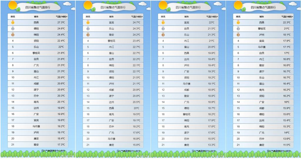 四川省气象台预计,10月下旬平均气温为:盆地13℃~16℃,川西高原 -2℃~15℃,攀西地区10℃~19℃。与常年同期平均值相比,盆地大部地方偏低(盆地常年平均气温13.2℃~18.2℃),省内其余地方正常。
