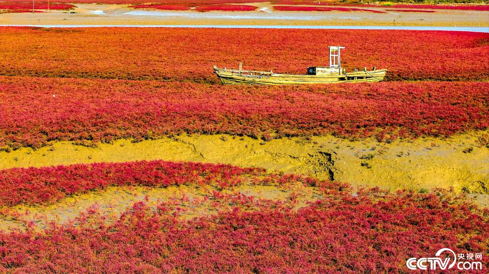 10月19日,山东省青岛市西海岸新区红石崖街道五河口与胶州湾交汇处的河海湿地,绚丽红艳的碱蓬草绵延成壮美的红海滩,与河流蓝海相映成景,一派美不胜收的迷人景象。