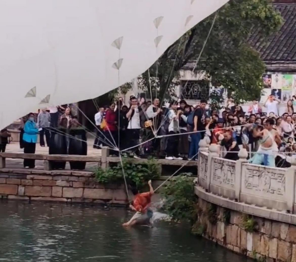·乌镇女演员表演时遇大风失控坠湖,景区回应:演员没事,节目不会再上演。