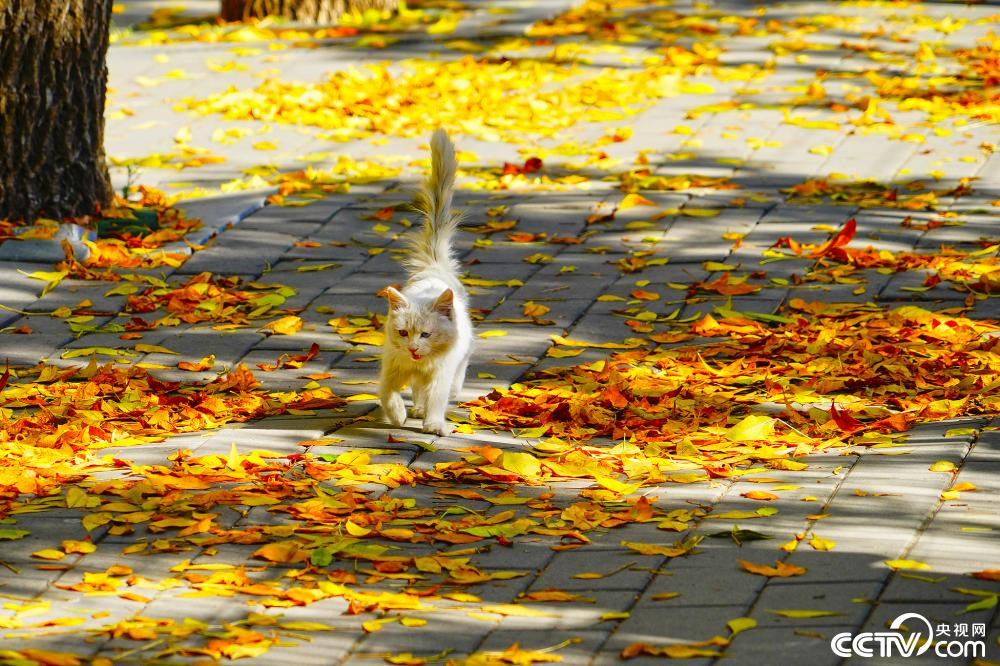 10月19日,北京,三里屯西五街秋意浓,阳光透过树荫,洒在道路两旁的落叶上,蔚蓝的天空与金色的白蜡树叶同框,形成油画般的色彩。