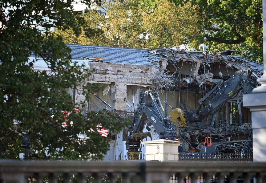 综合多家外媒报道,特朗普当天在白宫接见路易斯安那州立大学棒球运动员时提及有关工程,并表示访客“可能会不时听到施工声音”。现场画面显示,挖掘机拆除了东翼楼的外墙立面,砖块、碎石和钢筋散落一地。