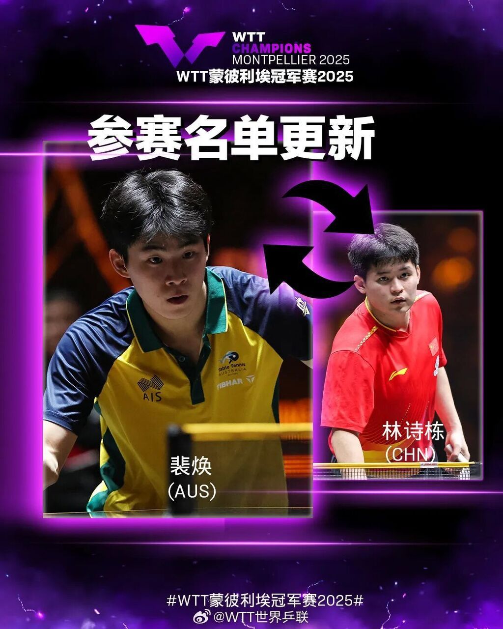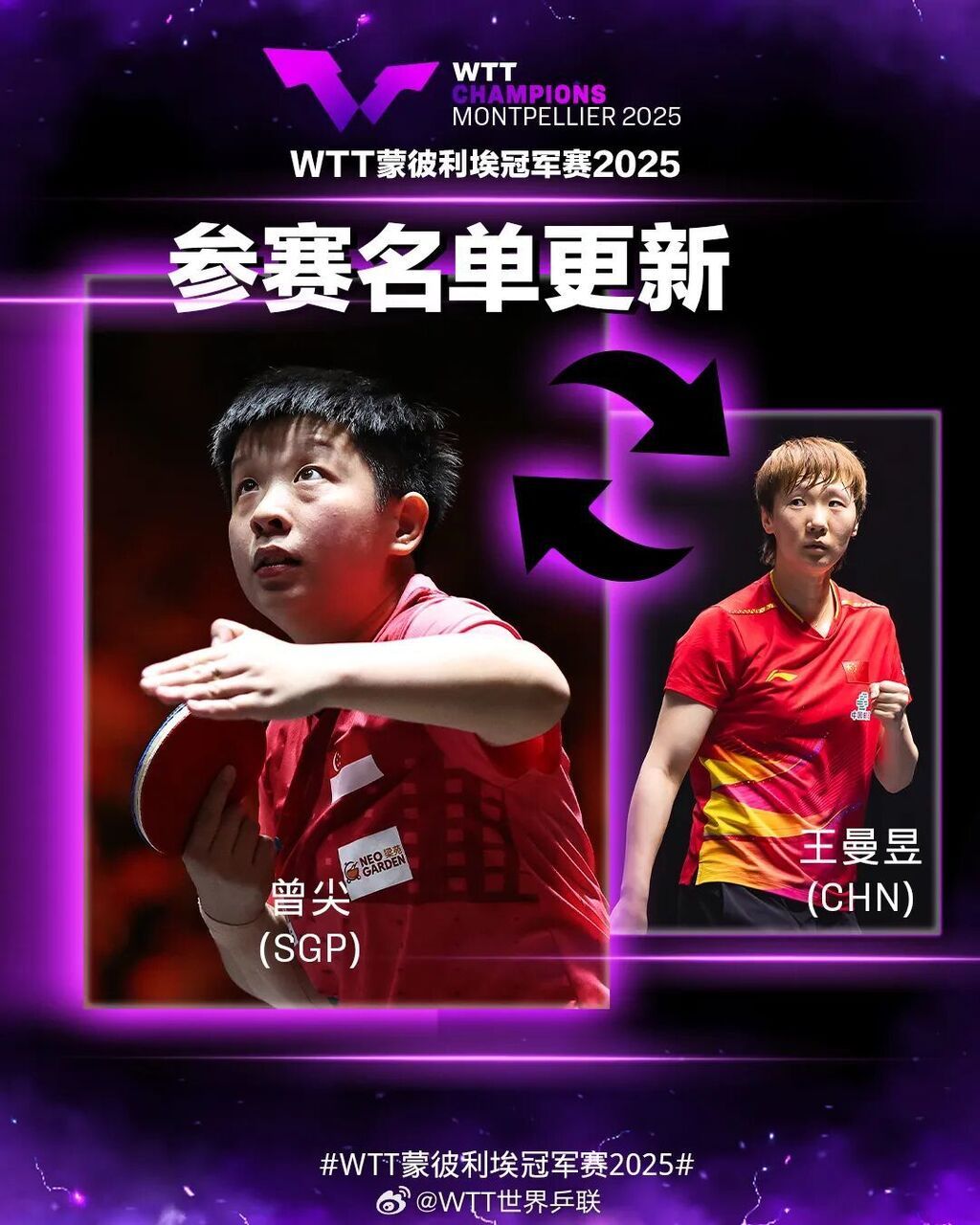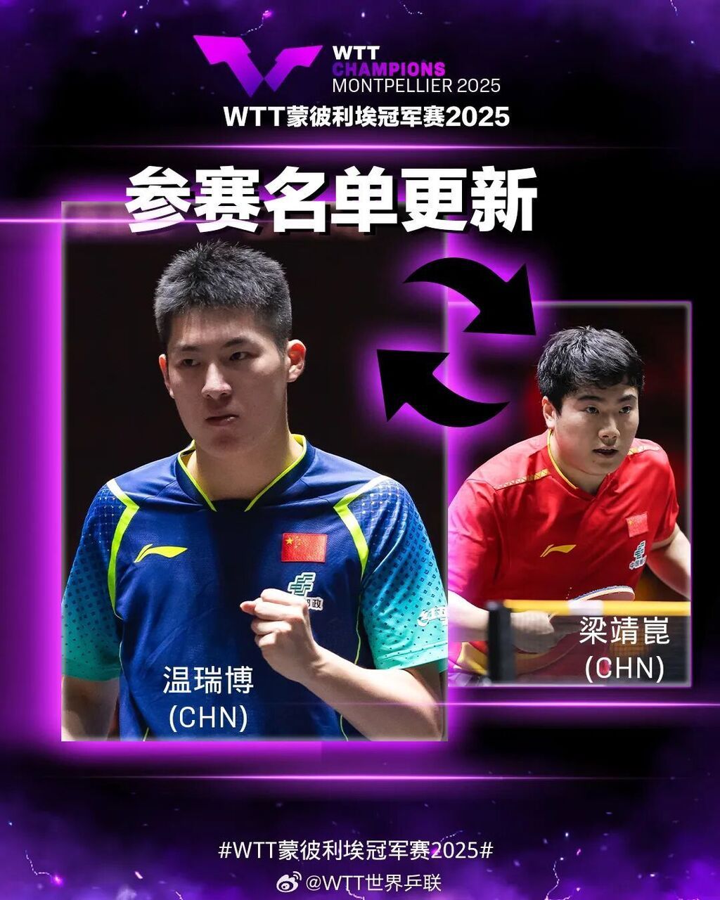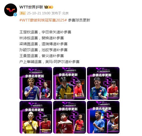 10月21日,据@WTT世界乒联 消息,WTT蒙彼利埃冠军赛2025参赛球员更新: