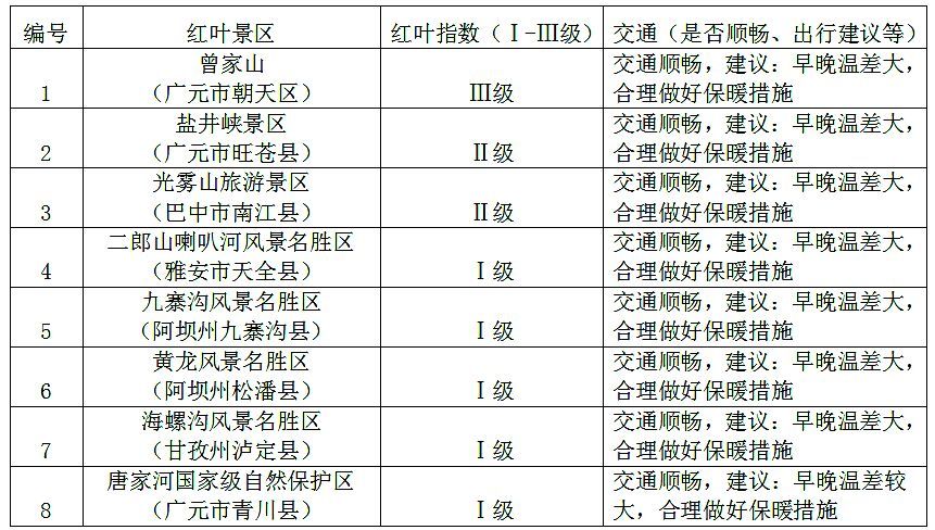 未来一周较适宜观赏红叶的景点,主要分布在我省东北部曾家山、盐井峡、光雾山景区。此外,今年受闰月和气候等因素影响,红叶观赏期较往年预计推迟10~15天。省林草旅游中心提醒,红叶宜晴朗天气观赏,大部分景区温差较大,需做好保暖措施,山路曲折,注意出行安全。