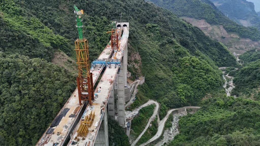 锦屏特大桥位于凉山州雷波县双河口乡火烧棚村,地处陡峭河谷地带,全长485米。在建设过程中,面临地形险峻、气候恶劣、技术复杂等多重困难。为破解施工难题,项目团队自主研发了多功能自爬式提升系统,这一创新技术通过优化支撑、顶升和起重结构,仅配置40米高塔吊即可将重达35吨的钢管组合结构精准吊装至135.2米高空。