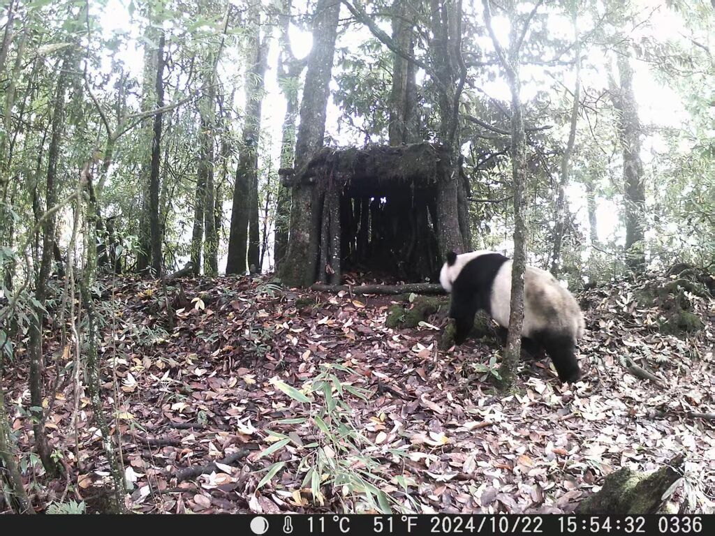 大熊猫国家公园眉山片区,大熊猫在搭建的人工巢穴附近活动(图片由受访者提供)